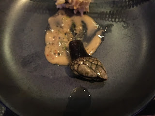 Course #5 had a lot going on! Fire, eel, corn on the cob, salmon cracker, and barnacles! Yes, barnacles! The salmon cracker and the corn was delicious and I even liked the eel, but the barnacles were a little strange. You are supposed to bite the flesh and then pulled the rest of it out of the shell with your teeth. It was very salty. Reminded me of the sea.
