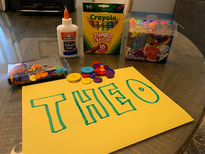 For the "Special Activity," Theo had to make a picture of himself using items from around the house. We used buttons for eyes and a beaded necklace for his mouth. Theo does not like to hold markers or color, but we tried.