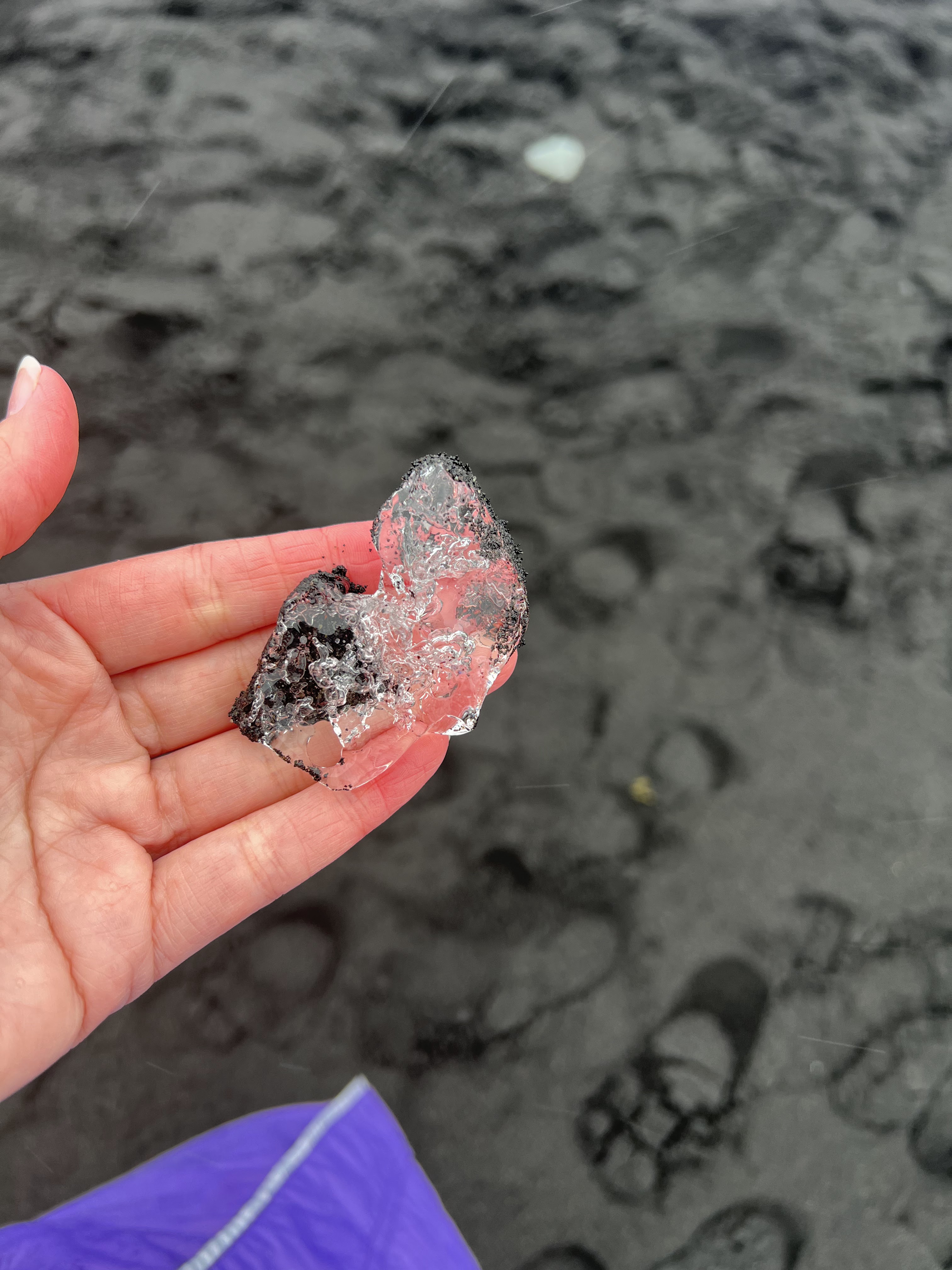This beach is covered with pieces of the Breiðamerkurjökull which is another one of the outlet glaciers from Vatnajökull. The ice calves from Breiðamerkurjökull, floats through the Jökulsárlón (glacial lake), and out to the ocean. Some pieces of ice get stuck on the beach and that's where the name "diamond beach" comes from.
